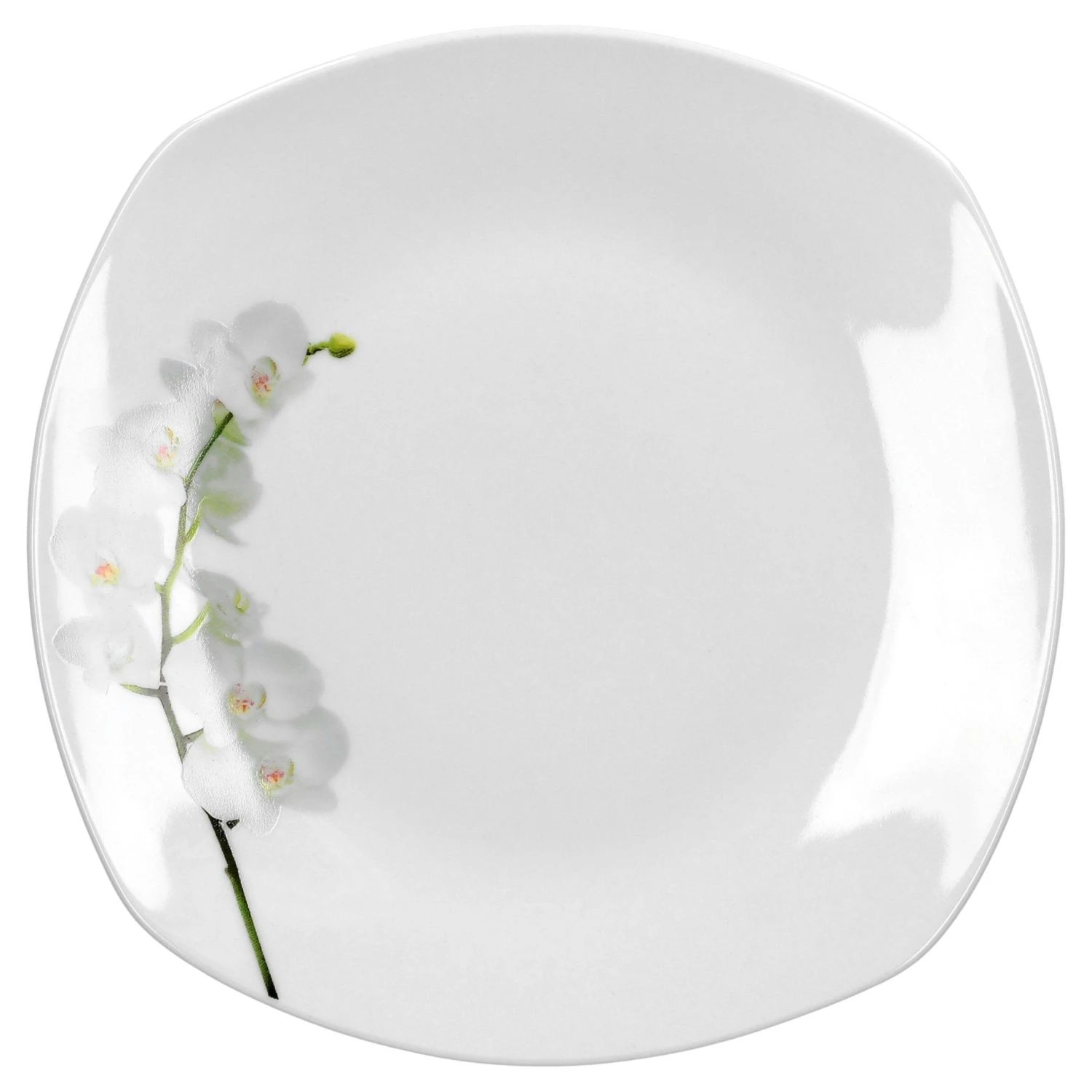 Wunderschöne Orchideen in kräftigem Rosa, zieren den breiten Rand der einzigartigen Tellerform mit hübschem Blumen-Dekor. Die abgerundeten Ränder des 190 x 190 mm großen Serviertellers dehnen sich, in der Draufsicht, bogenförmig nach außen und gehen in den Ecken weich ineinander über.